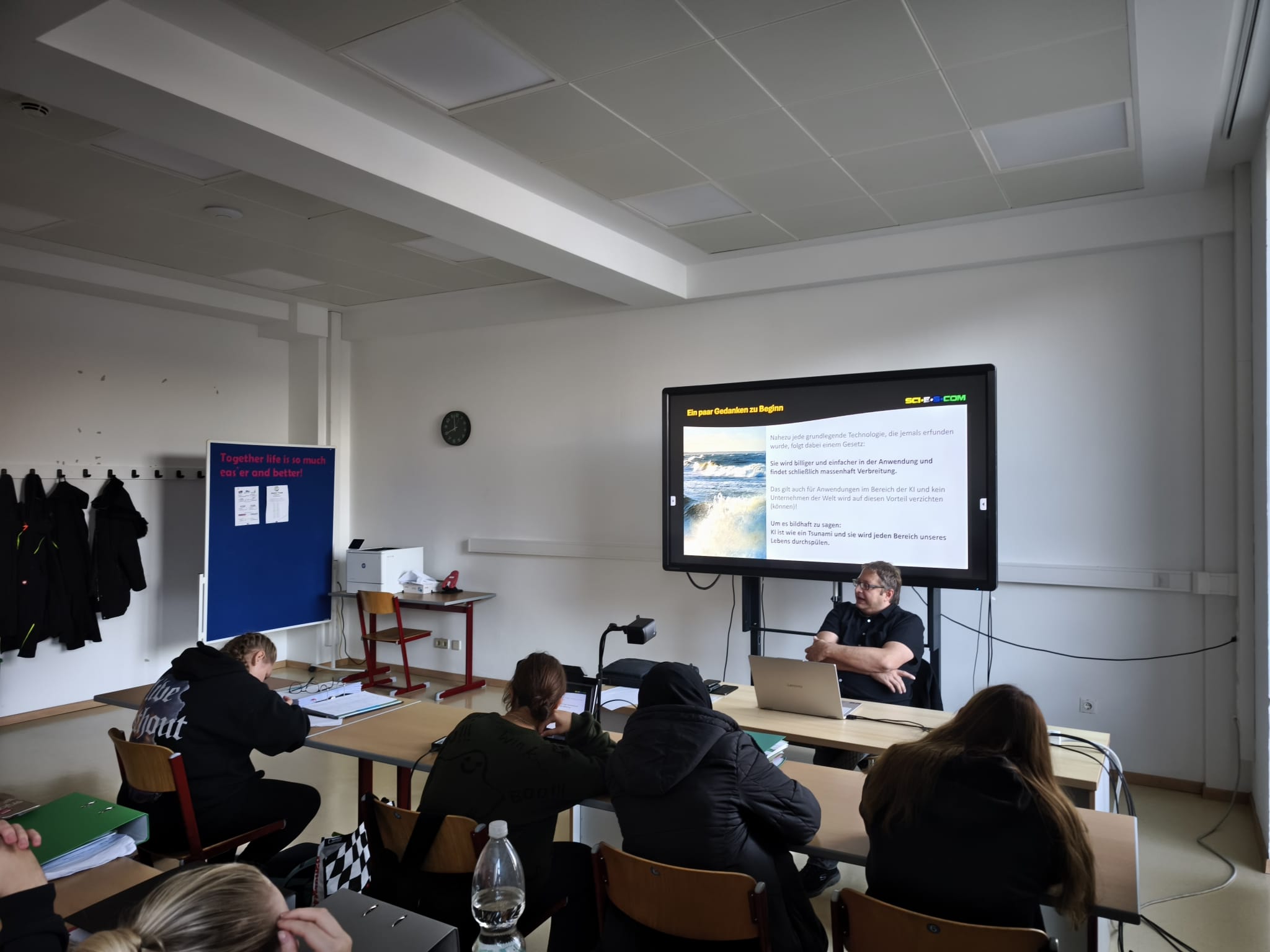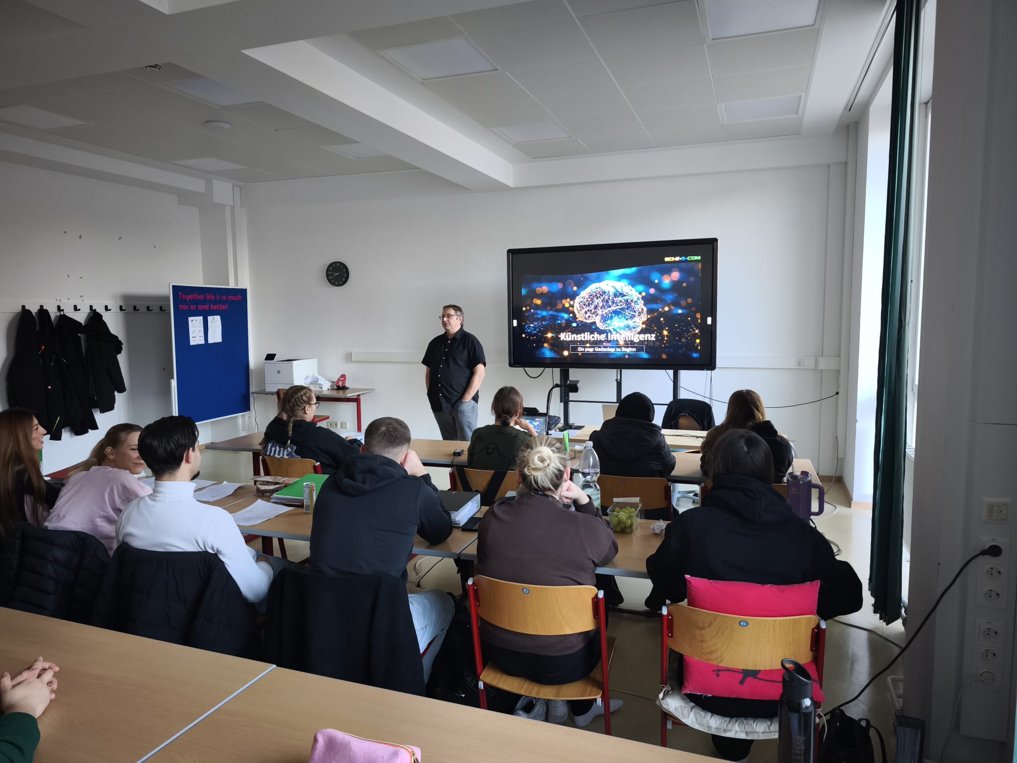Wie auch heute in der 2Bü1, fanden in diesem Lehrgang in mehreren Klassen spannende Workshops zum Thema Künstliche Intelligenz statt, veranstaltet von der Wirtschaftskammer Niederösterreich. Vortragender war Mag. Dr. Johannes Leitner, CMC, der den Schüler:innen auf anschauliche Weise die Grundlagen der KI näherbrachte und zeigte, wie Anwendungen wie beispielsweise ChatGPT oder Google NotebookLM im Alltag sinnvoll eingesetzt werden können.