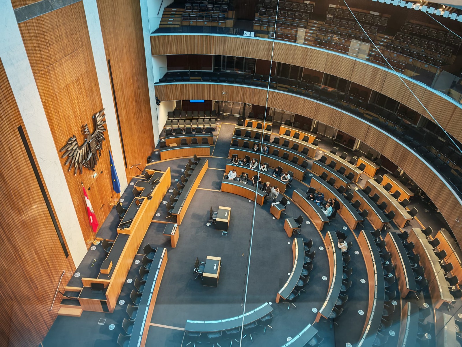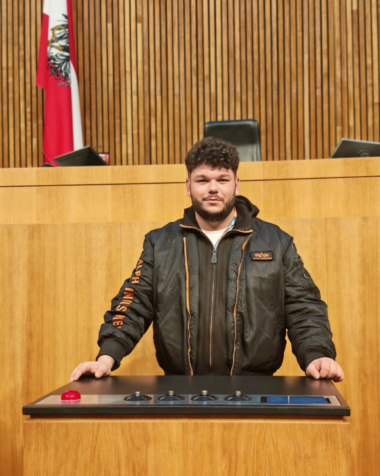 Im Anschluss an den Workshop erhielten die Lehrlinge die Möglichkeit, den neuen Sitzungssaal sowie die historische Säulenhalle des Parlaments zu besichtigen. Für einen kurzen Moment schlüpften sie dabei in die Rolle politischer Entscheidungsträger*innen und konnten parlamentarische Abläufe hautnah erleben.